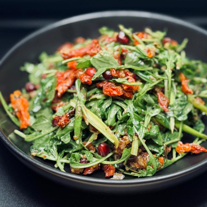Seared asparagus, arugula, bacon jam, sundried tomato, pomegranate seeds, bacon fat & warm spice vinaigrette (GF)