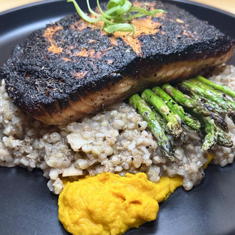 House blackening spices, coconut buckwheat risotto, carrot puree, asparagus (GF)