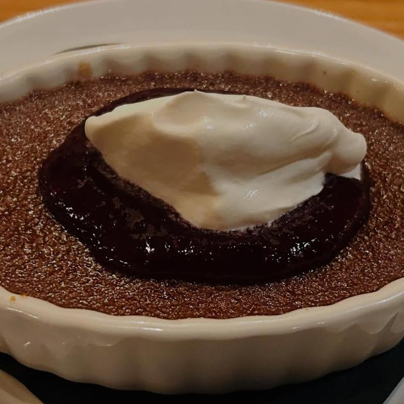Chocolate & mixed berry custard, melba, fresh whipped cream (VG/GF)