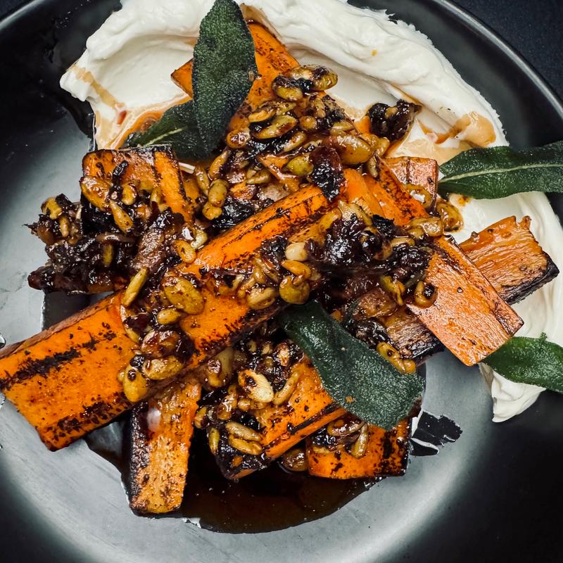 Roasted & grilled carrots, honey labneh, sunflower & pepita salsa seca, fried sage, pomegranate amaro gastrique (GF/VG)